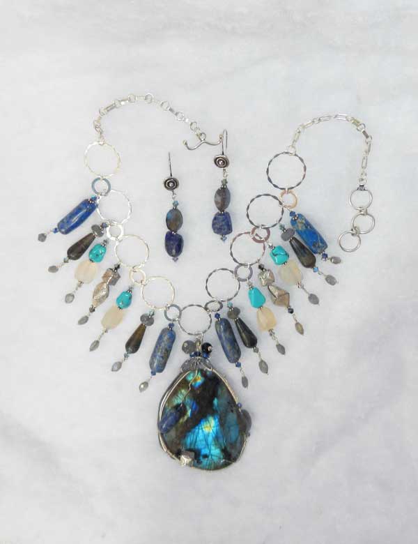 Blue Butterfly Necklace Components: labradorite, lapis, turquoise, chalcedony, onyx, Silver Art Clay, sterling, crystals $475.00 SALE $350.00 length: 19 1/2''- 20 1/2'' · centerpiece: 4'' L x 2 1/2'' W total weight: 5.65 oz