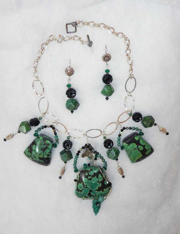 Fern Grotto Necklace Components: Chinese turquoise, chalk turquoise, onyx, crystals, sterling, Silver Art Clay $260.00 length: 18'' · weight: 4.75 oz centerpiece: 4 1/2'' L x 1 3/4'' W