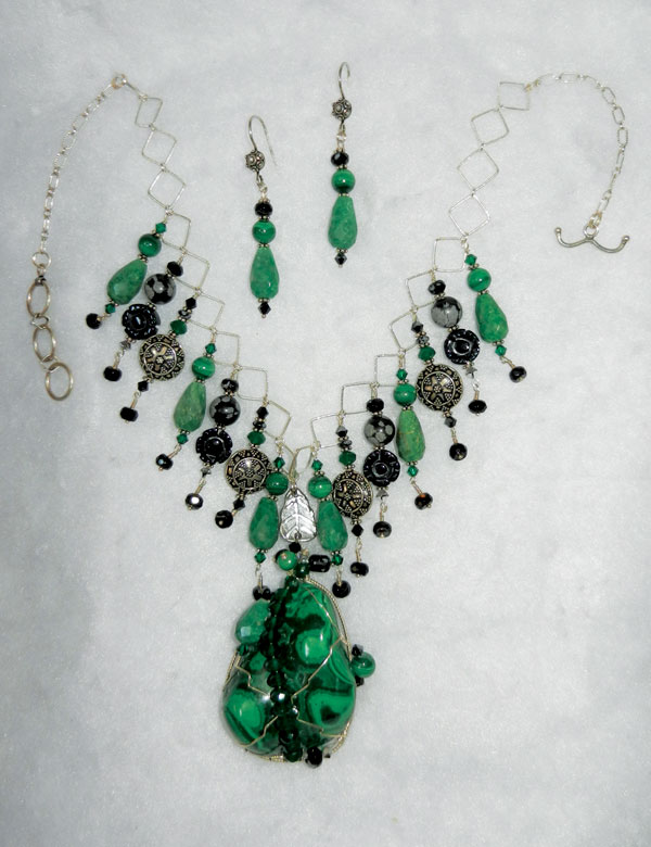 Majestic Malachite Necklace Components: malachite, amazonite, onyx, snowflake obsidian, Silver Art Clay, sterling, crystals $400.00 length: 19''- 20 1/2'' · centerpiece: 3 1/2'' L x 1 3/4'' W total weight: 5.95 oz