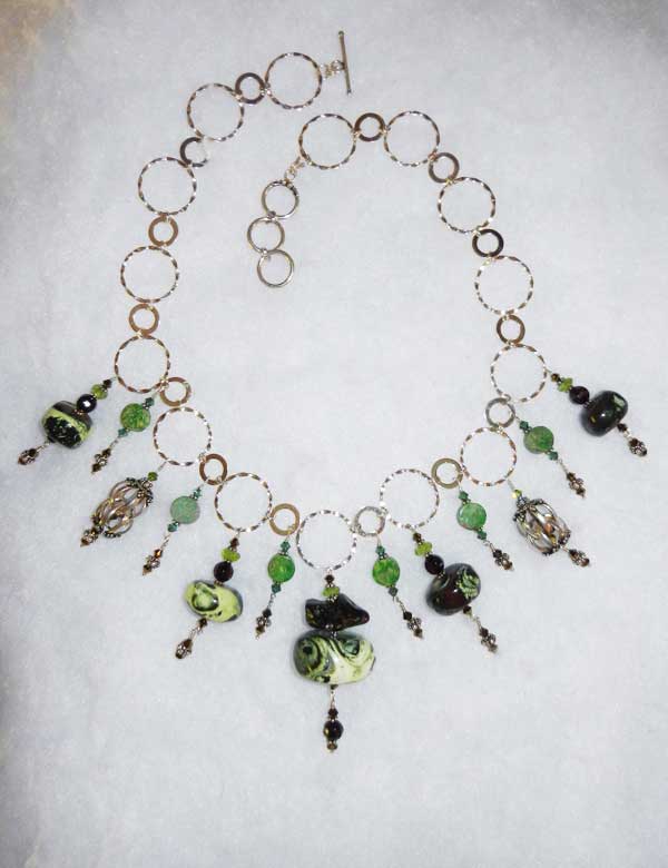 Mint Chip Necklace Components: bamboo coral, amber, chalk turquoise, peridot, crystals, sterling $250.00 length: 21'' - 22 1/2'' · weight: 3.9 oz centerpiece: 2 1/2'' L x 1 1/4'' W