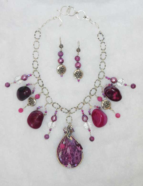 Rose Petals Necklace Components: sugilite, fuchsia dyed agate, pink "jade", pearl, Silver Art Clay, sterling, crystals CURRENTLY UNAVAILABLE Earring Components: sugilite, pearl, sterling, crystals CURRENTLY UNAVAILABLE