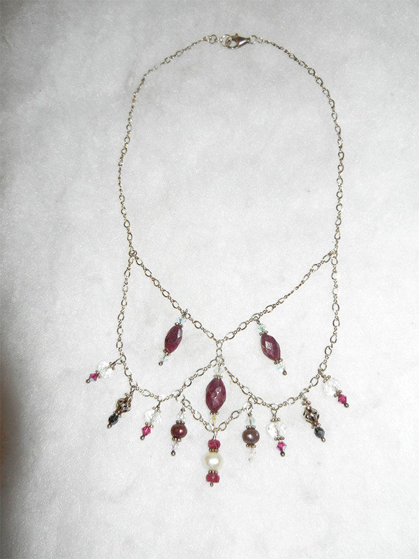 Rubies and Ice Necklace Components: ruby, pearl, crystals, sterling CURRENTLY UNAVAILABLE - "Similar to" may be commissioned. length: 16'' · weight: .65 oz.