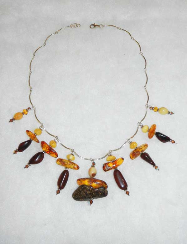 Amber Potato Chips Necklace Components: amber, golden "jade", crystals, sterling $150.00 SALE $110.00 length: 18'' · weight: 1.05 oz centerpiece: 1 3/4'' L x 1 1/4'' W