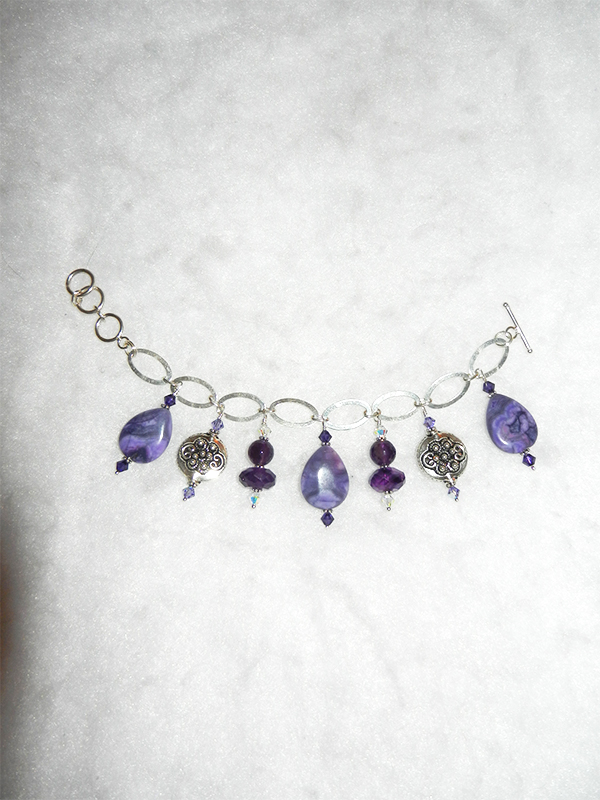 Amethyst Amore Wrist Halo Components: amethyst, crazy lace agate, crystals, sterling and Bali silver $75.00 length: 6 1/4'' x 7 1/4'' · length of elements: 1 1/4'' weight: 1 oz.