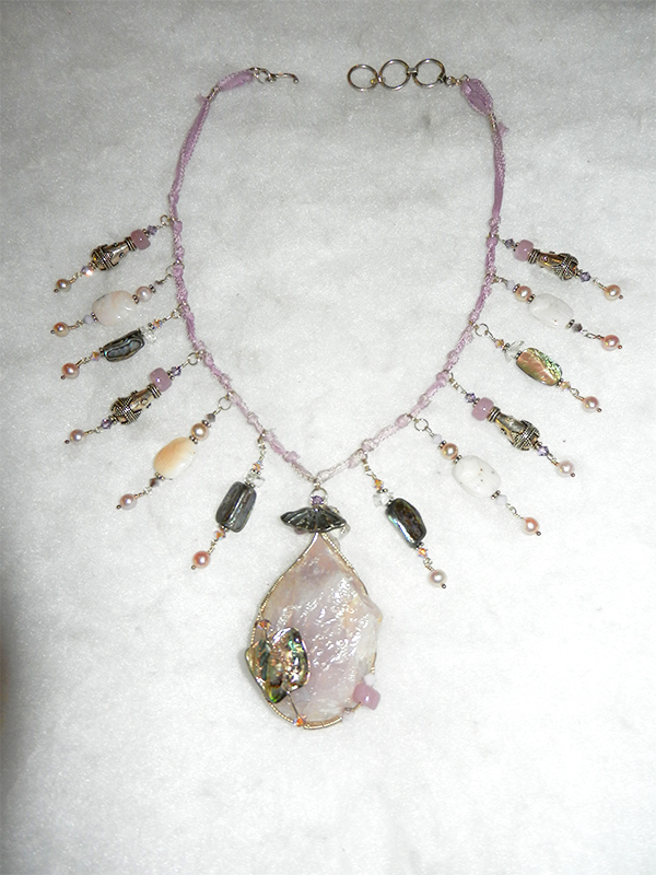 orchid quartz, pink opal, vintage glass, abalone, pearl, crystals, Silver Art Clay, sterling and Bali silver, pink silk ribbon