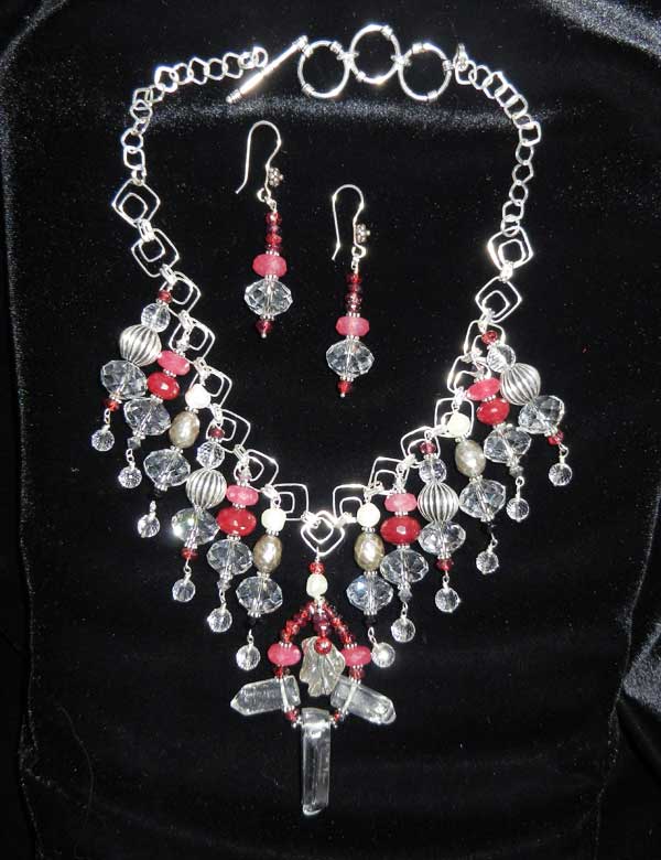 Crystal Cross Necklace Components: crystals, merlot quartz, rubelite, garnet, pearl, Silver Art Clay, sterling $230.00 length: 16 - 17'' · weight: 3.35 oz center piece: 3'' L x 2'' W