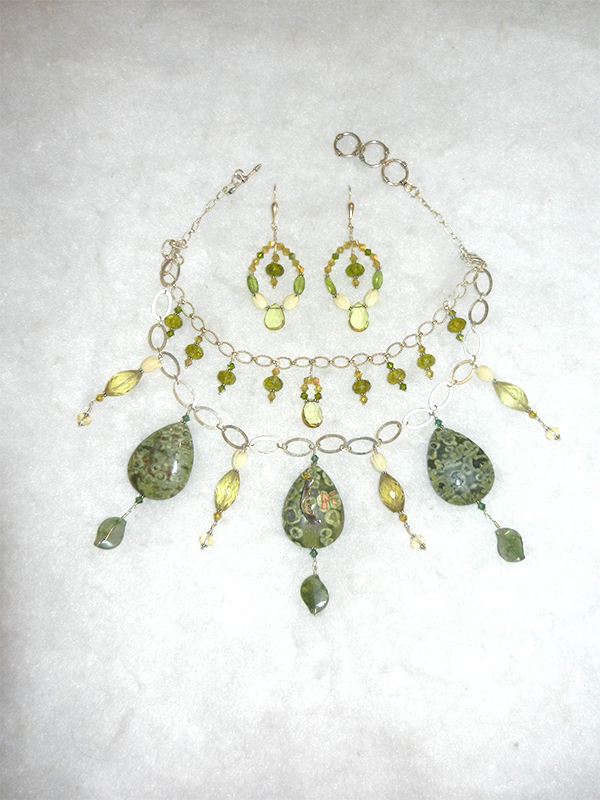 rhyolite, citrine, moss agate, bone, peridot, crystals, Silver Art Clay, sterling and Bali silver.