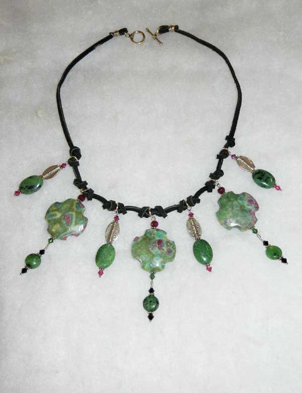 Las Cruces Necklace Components: ruby-zoisite, ruby, sterling, crystals, leather cord $125.00 SALE $95.00 length: 19 1/2'' · weight: 2.20 oz centerpiece: 3 1/4'' x 1 1/4''