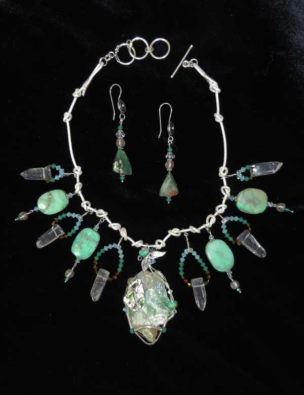Mint Icicles Necklace Components: emerald calcite, crystals, chrysoprase, abalone, sterling, Silver Art Clay, silver leather CURRENTLY UNAVAILABLE Earring Components: chrysoprase, crystals, sterling CURRENTLY UNAVAILABLE