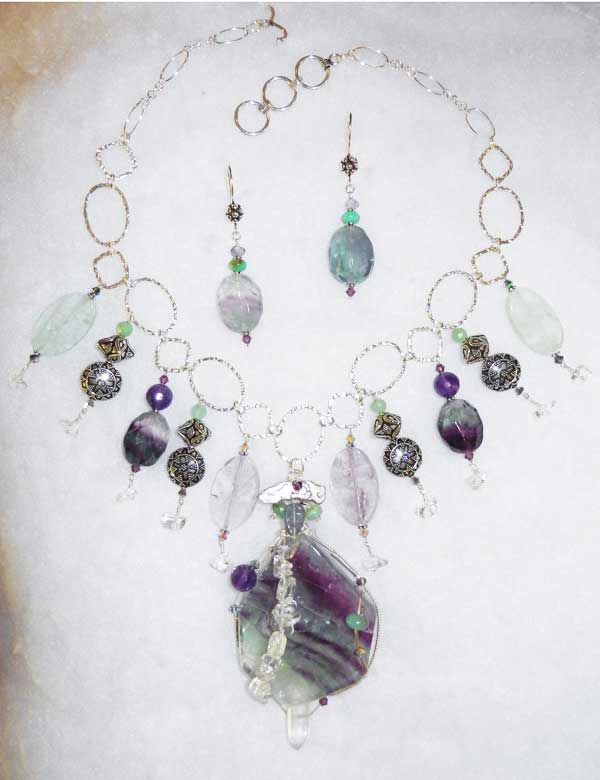 Rainbow Popsicle Necklace Components: fluorite, amethyst, chrysoprase, crystals, sterling, Silver Art Clay $280.00 length: 19'' - 20 1/2'' · weight: 6.65 oz centerpiece: 4'' L x 2 1/4'' W