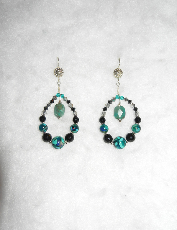 Tahoe Earring Components: Peruvian opal, "new" azurite, onyx, crystals, sterling and Bali silver $45.00 length: 3 1/2'' · width: 1 1/2'' total weight: .50 oz.