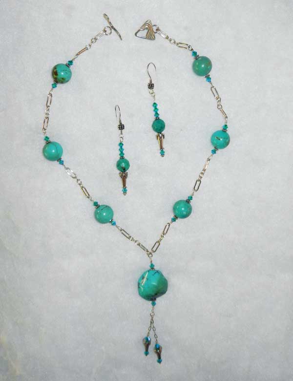 Turquoise Lariat Necklace Components: turquoise, sterling, crystals $115.00 length: 18'' · weight: 1.55 oz center piece: 3 1/2'' L x 1'' W