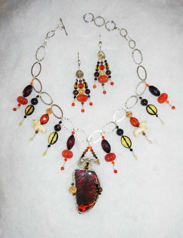 Volcano Necklace Components: ammolite, carnelian, amber, bone, Silver Art Clay, sterling, crystals, gold paint CURRENTLY UNAVAILABLE Earring Components: carnelian, amber, bone, Silver Art Clay, sterling, crystals, gold paint CURRENTLY UNAVAILABLE